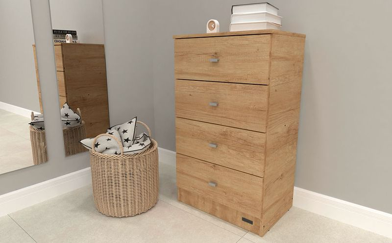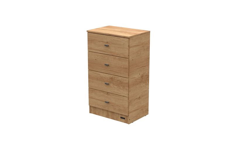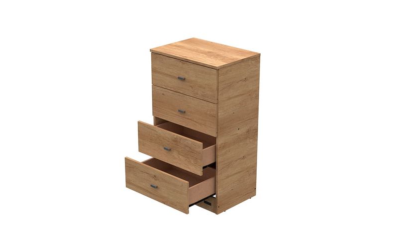 4 cajones con correderas metalicas y tiradores plasticos color gris. Interior y laterales no revestidos.