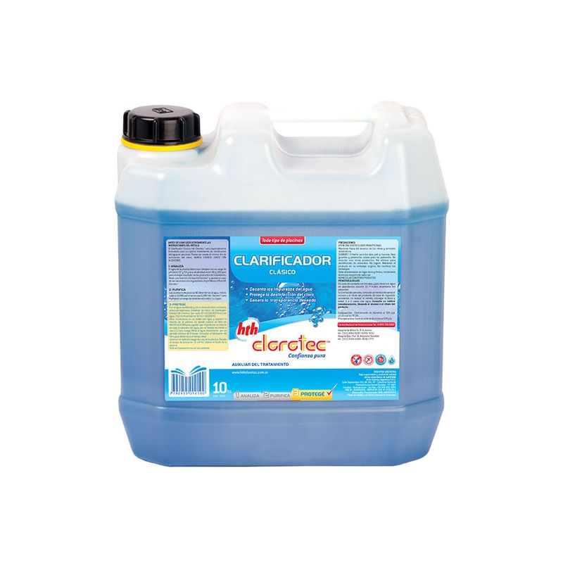 Características- Decanta las impurezas del agua.- Decanta las impurezas del agua- Protege las desinfección del cloro- Genera la transparencia deseadaInstrucciones1- Luego de agregar la dosis de cloro necesario, dosificar 50 ml de clarificador por cada 10 m³ de agua. 250ml actúan en 50 m³32- Diluir el producto en un balde con agua y esparcir la mezcla en la piscina. Se puede colocar el filtro en recirculación par ayudar que el producto se mezcle en todo el volumen del agua por un tiempo no menor a una hora.3- Luego giltrar el agua diariamente por un período mínimo de 6 horas. Consultar al fabricante del filtro para determinar el tiempo ideal.- Aplicarlo luego del uso de la pisicna. Pasado el tiempo de actuación (6 a 8 hs) aspirar el fondo de la piscina.5- Aplciar una vez por semana