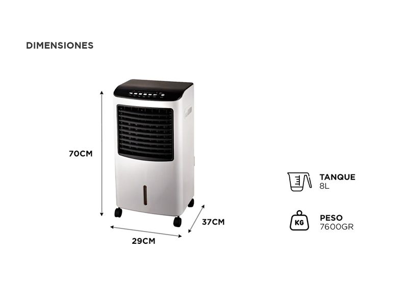 El tanque de agua de 8 litros, ubicado en la parte inferior, facilita el llenado y permite un funcionamiento prolongado. Incluye un control remoto para mayor comodidad y un temporizador programable de hasta 7.5 horas. El motor de aluminio asegura durabilidad y eficiencia energética, convirtiendo a este calefactor en una opción confiable y versátil para cualquier hogar.