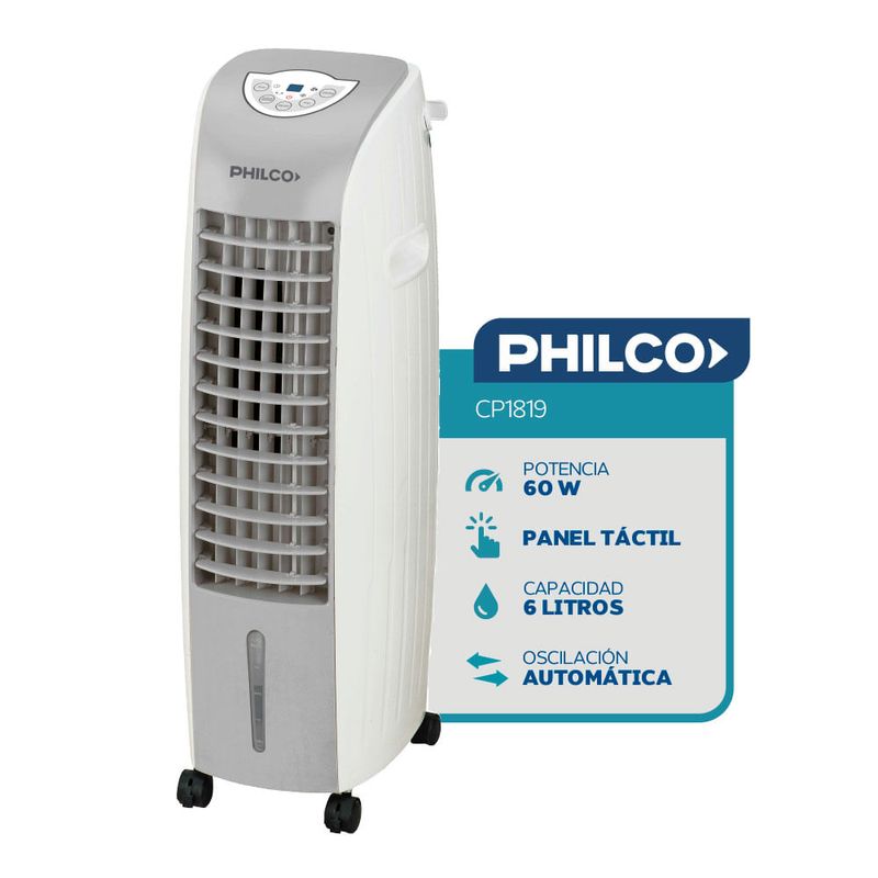 El climatizador portátil Philco tiene 3 velocidades, tanque de 6 litros, función frio de 60 watts, timer e incluye control remoto.