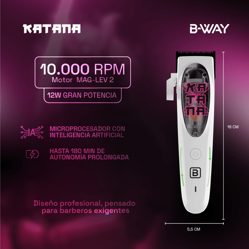 La Katana BWAY lleva la barbería a un nuevo nivel gracias a su motor híbrido MAG-LEV 2 y su chip de Inteligencia Artificial, que ajusta automáticamente la potencia según la densidad del cabello.