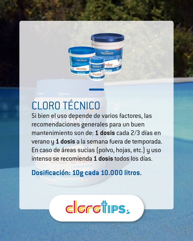 1- Agregar Cloro Técnico Clorotec siendo la dosis inicial de 10g cada 10m3 de agua (10.000 litros). Utilizar la cuchara dosificadora que se encuentra dentro del envase. (Una cuchara tiene una dosis de 10g aprox.). Dejar actuar al menos 30 minutos antes de ingresar a la misma.