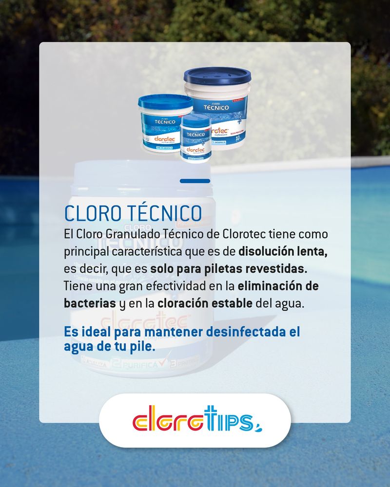 4- Si el nivel de cloro baja a 1 ppm primero verificar con Cinta Test Kit si el Estabilizante está por encima de 100. Si es así ¡NO agregar más cloro! Primero agregar agua cruda y volver a medir, y si ese momento el cloro da por debajo de 1 agregar más cloro hasta el doble de la dosis de mantenimiento de Cloro Técnico Clorotec.
