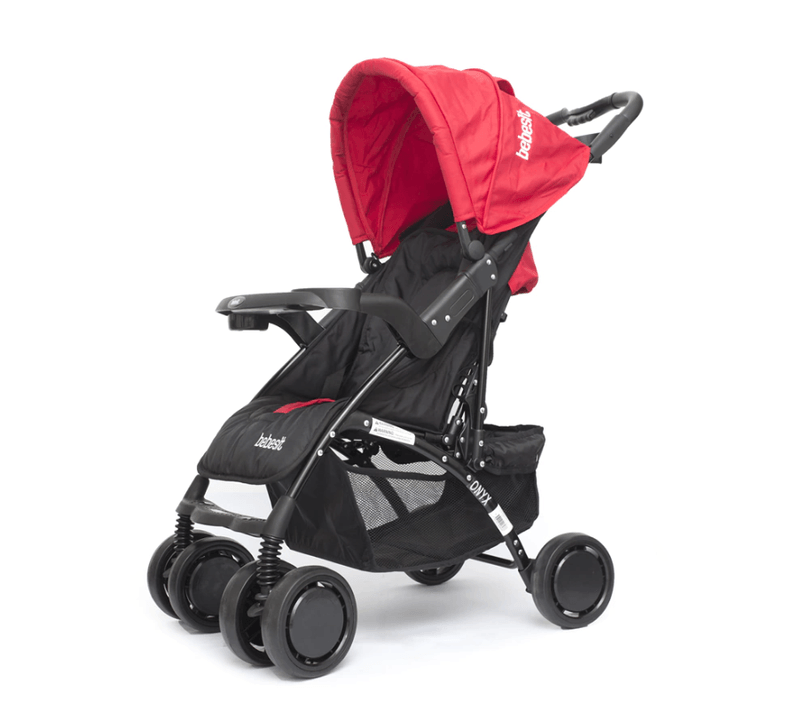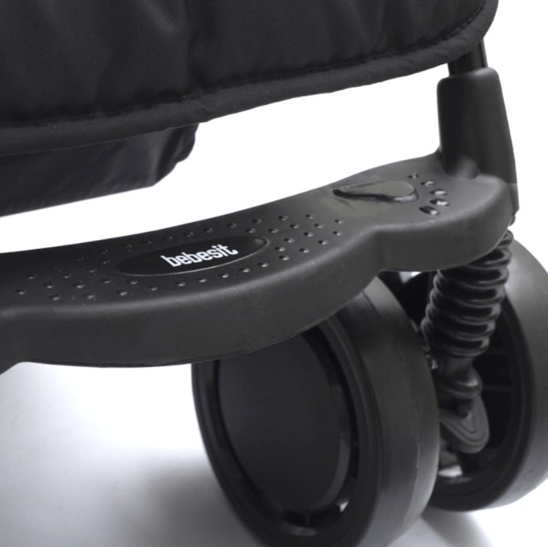 Ruedas delanteras giratorias con suspensión y ruedas traseras con freno.