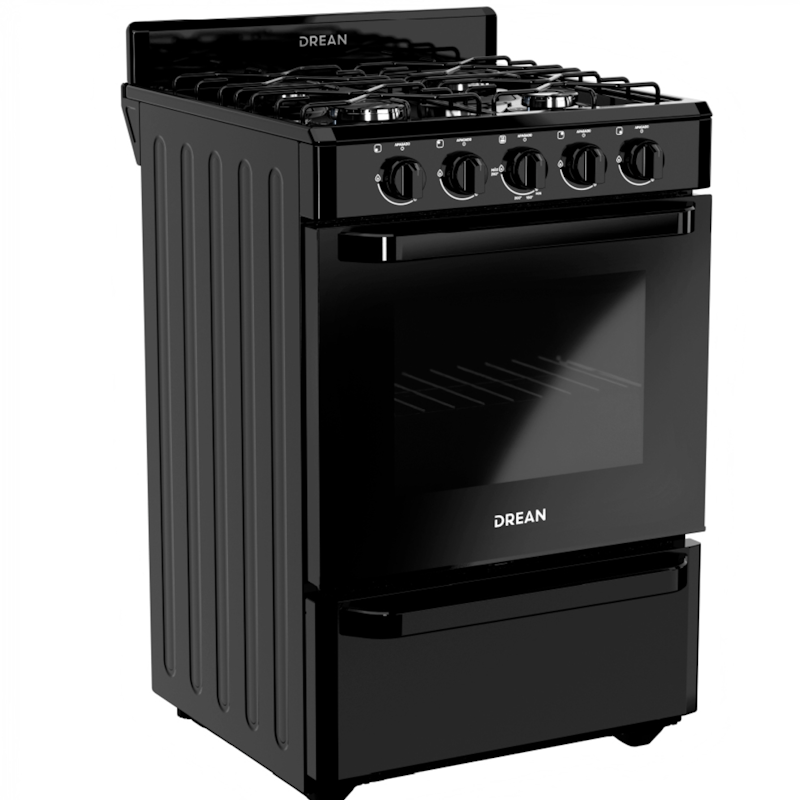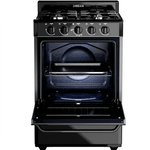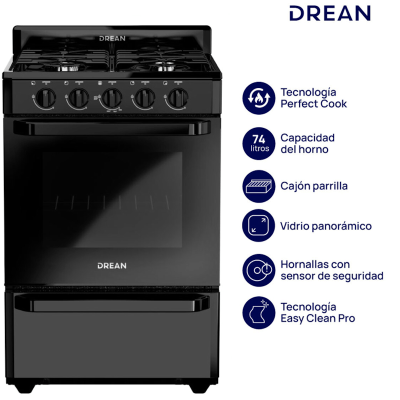 Tipo de producto: Cocina multigas con horno y hornallas multitamaño Sistema: Multigas con eficiencia energética Gas A Medidas: 55 cm (ancho) x 66 cm (profundidad) x 88,5 cm (alto) Color: Negro Rejillas: Enlozadas Conexión: Multigas Capacidad del horno: 2 parrillas Tecnología de cocción: Perfect Cook (calor envolvente y uniforme) Hornallas: 4 Fast Cook multitamaños con diseño Avant y sensor de flama Sistema de limpieza: Easy Clean Max con acabado cerámico antiadherente Puerta del horno: Doble vidrio panorámico negro con luz interior