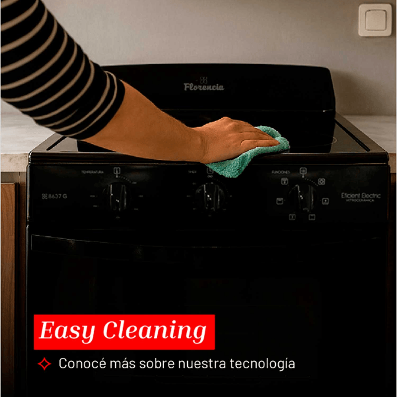 El horno de la Florencia 8637G ofrece 3 tipos de cocción, selector grill, termostato regulable y 2 zonas de calentamiento para cocinar de forma pareja. Su interior cuenta con revestimiento Easy Clean, luz interior, temporizador, y una rejilla deslizable integrada a la puerta que mejora la experiencia de uso y evita accidentes al manipular bandejas calientes.