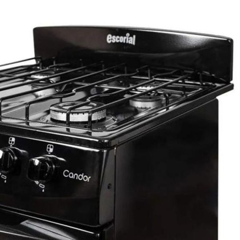 La cocina Escorial está totalmente enlozada en polvo electroestático y cuenta con puerta de horno con visor; bisagra desmontable y reja de plancha con apoya ollas. Por otro lado, dispone perillas de plástico inyectado, manija de plástico, respaldo extraible, horno y parrilla con sistema fácil limpieza (easy to clean).
