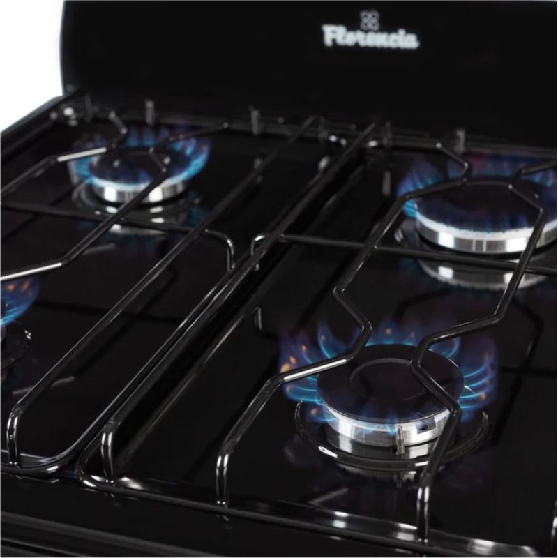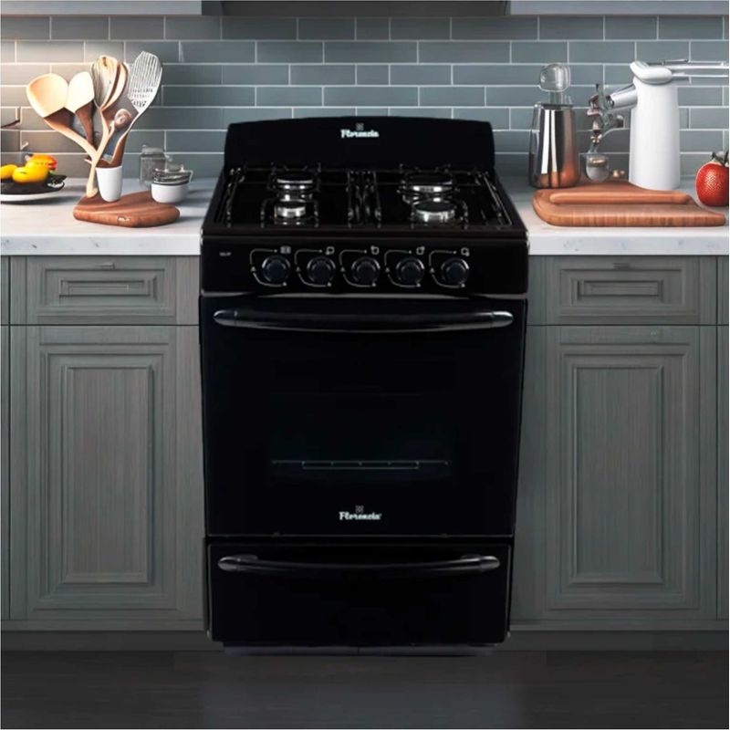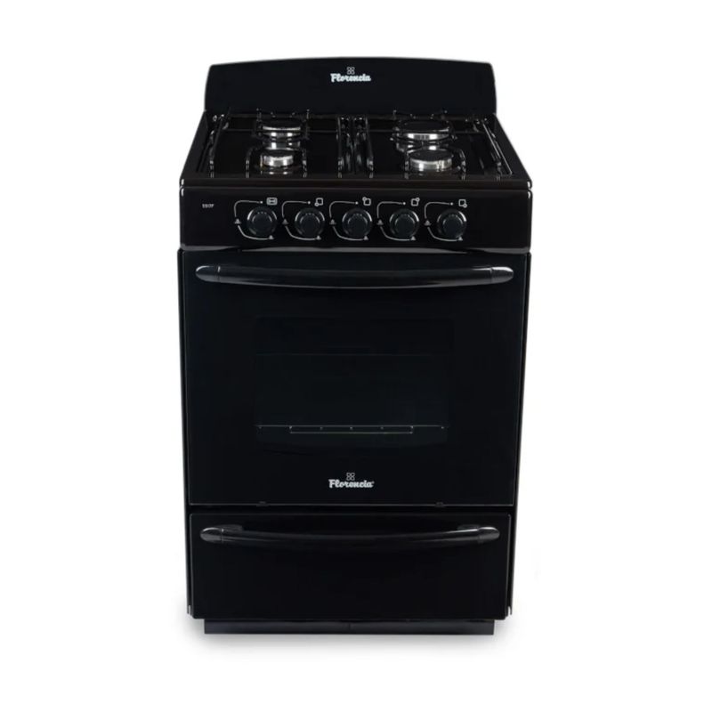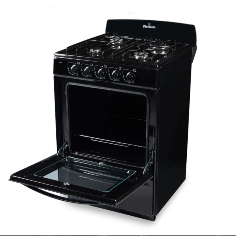Florencia 5517F cocina a gas combina funcionalidad y estilo en un formato compacto de 56 cm de ancho, ideal para cocinas con espacio limitado. Su terminación en color negro le da un toque moderno y sobrio, mientras que las rejillas de alambre enlozado aseguran resistencia y fácil mantenimiento. La puerta del horno con doble cristal mejora la aislación térmica y permite una mejor visibilidad durante la cocción.