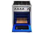 Equipada con mecheros de aluminio de alta calidad y un potente quemador triple corona, garantiza una cocción pareja y rápida. El horno cuenta con luz interior, encendido electrónico instantáneo y válvula de seguridad con unidad magnética, asegurando el máximo nivel de protección.