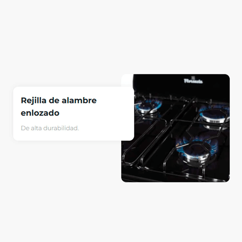 Florencia 5507 cocina a gas combina funcionalidad y estilo en un formato compacto de 56 cm de ancho, ideal para cocinas con espacio limitado. Su terminación en color negro le da un toque moderno y sobrio, mientras que las rejillas de alambre enlozado aseguran resistencia y fácil mantenimiento.