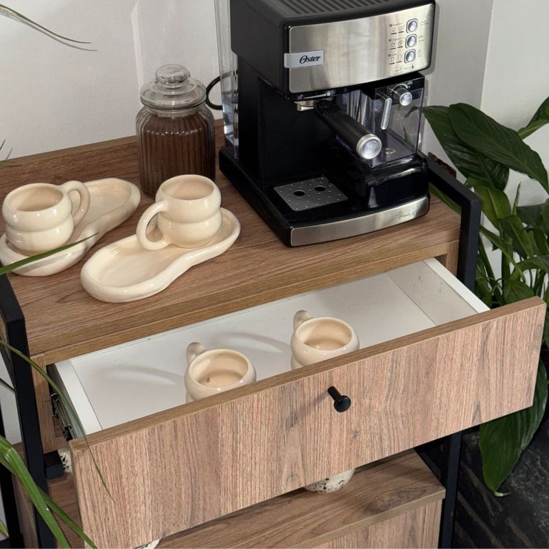 El diseño de puertas y cajón permite ocultar las tazas y suministros, manteniendo todo organizado y fuera de la vista. La superficie superior ofrece espacio para la cafetera o decorar con plantas o utensilios.