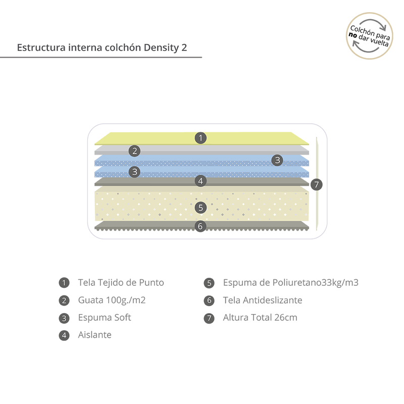 El colchón está diseñado de la base hacia arriba; utilizando materiales hipoalergénicos, durables y de alta calidad. Una novedosa construcción que permite que los colchones nunca sean dados vuelta, evitando así el esfuerzo innecesario que provoca la rotación de otros sistemas de descanso.
