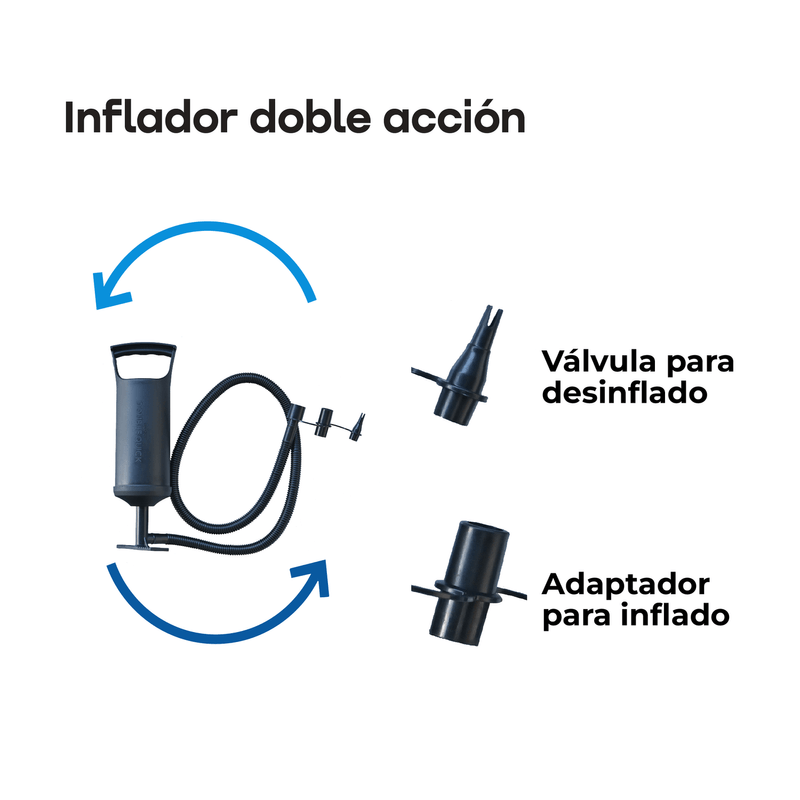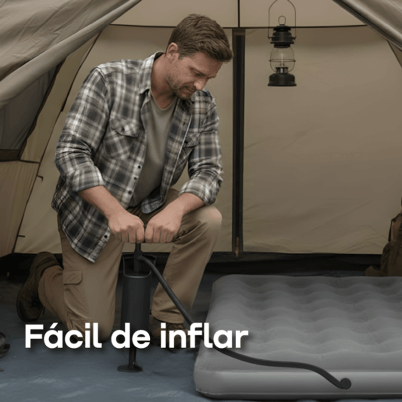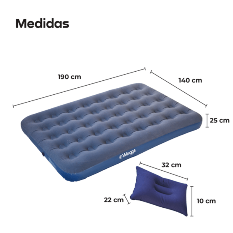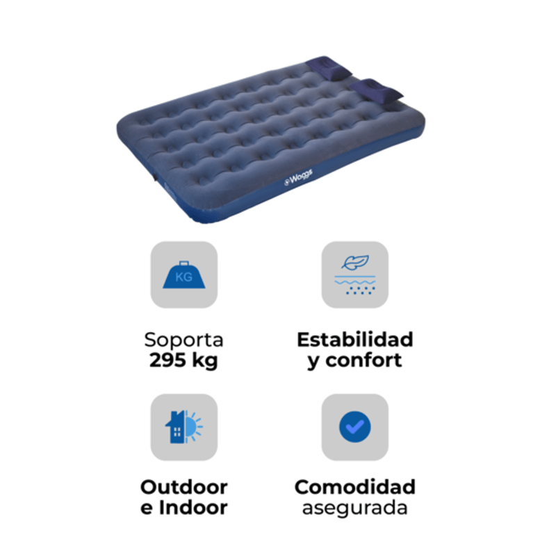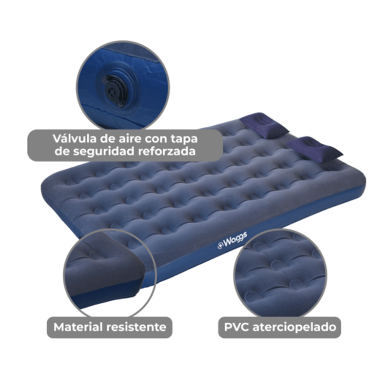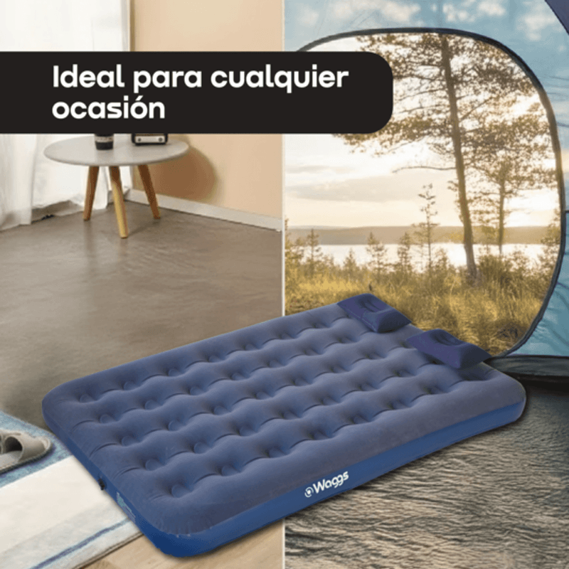 Con el colchón inflable de 2 plazas WAGGS COLI02 mejorá tu descanso en cualquier lugar con una solución cómoda, práctica y resistente, ideal tanto para camping como para uso en casa. Su superficie de PVC felpada y aterciopelada brinda mayor suavidad, evita deslizamientos y mejora la experiencia de descanso, mientras que su estructura interna de cámaras distribuye el peso de forma uniforme para lograr una firmeza estable durante toda la noche. Incorpora bomba manual integrada para inflarlo en minutos sin soplar ni usar accesorios externos e incluye 2 almohadas inflables que aportan un plus de confort y mejor postura. Con dimensiones amplias para dos personas, alta capacidad de carga y un diseño portable y fácil de guardar, es la opción perfecta para escapadas, visitas o situaciones donde necesitás una cama adicional confiable, con la calidad y comodidad que distingue a WAGGS.