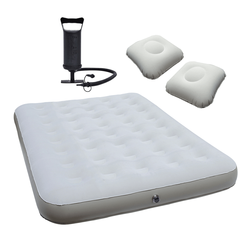 Incluye un colchón inflable de 2 plazas, 2 almohadas inflables y un inflador de mano de doble acción, ofreciendo comodidad y practicidad en todo momento.