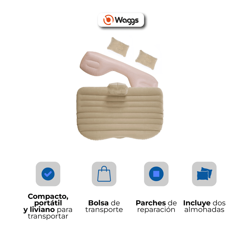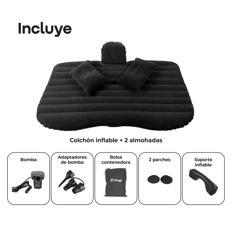 Transformá tu auto en un espacio de descanso con el colchón inflable WAGGS COLI03, diseñado para adaptarse al asiento trasero de la mayoría de autos, camionetas y SUVs. Fabricado en PVC flocado de alta calidad, combina resistencia, suavidad y confort, ideal para viajes, escapadas o descansos improvisados. Su estructura ergonómica brinda una superficie estable y segura, mientras que su diseño compacto y plegable facilita el guardado y transporte. Incluye bomba eléctrica de 70 W con conector de 12 V, dos almohadas inflables, bolsa de transporte, boquillas y parches de reparación. Ligero y práctico, el WAGGS COLI03 convierte tu vehículo en un espacio cómodo para dormir o relajarte donde estés.