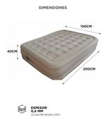 El colchón inflable CAMP0147 ofrece dimensiones amplias de 200 × 150 cm, ideal para dormir cómodamente dos adultos.