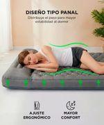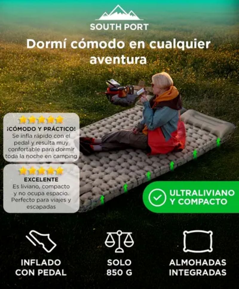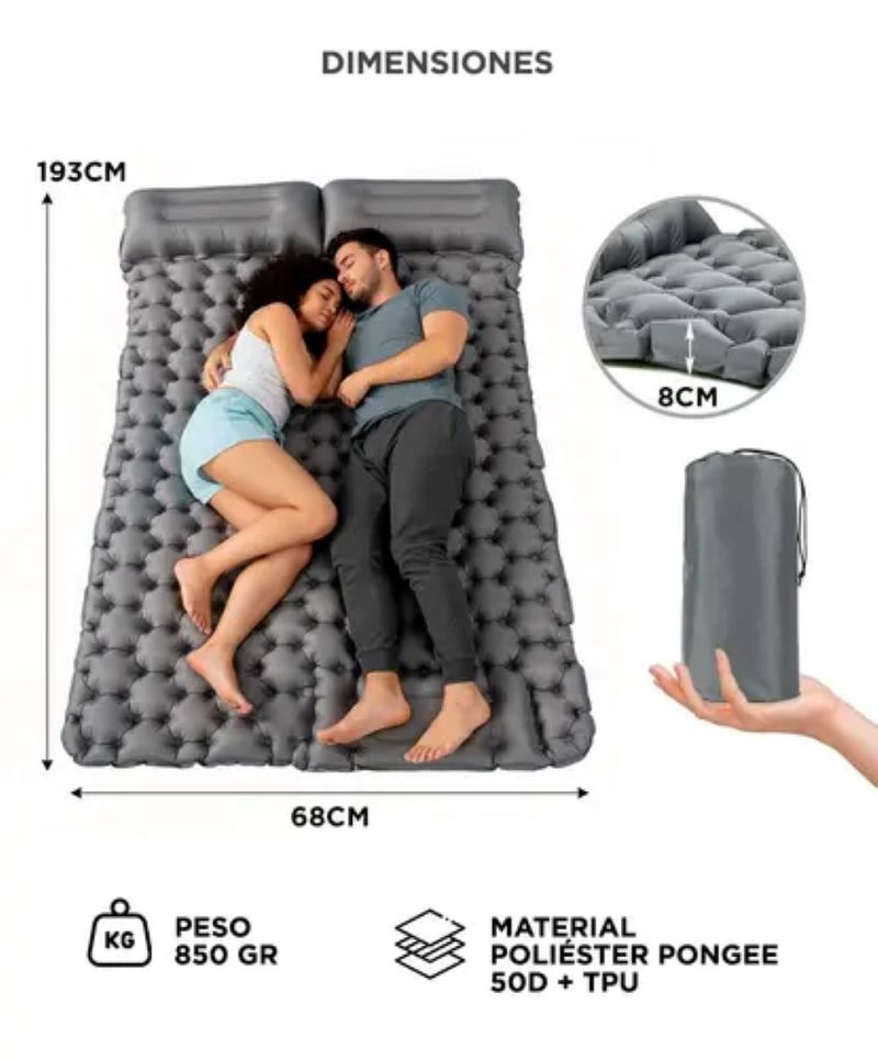 Su diseño inflable distribuye el peso de forma equilibrada, mejorando la estabilidad y el confort durante el descanso, incluso en superficies irregulares.