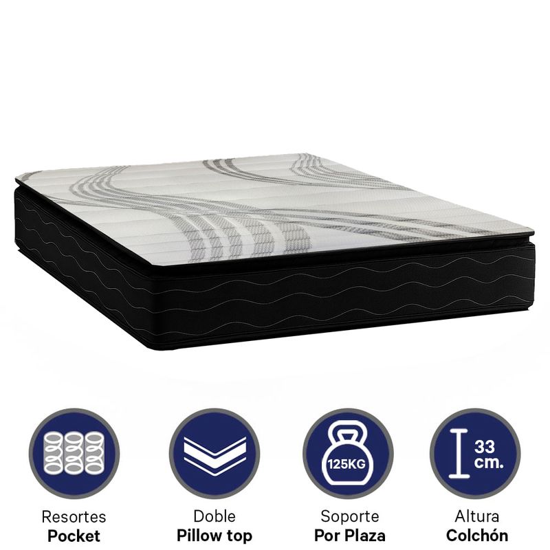 Colchón Prisma Pillow está fabricado con Resortes Pocket enfundados de acción individual que minimizan la transferencia de movimiento, esta estructura de tecnología alemana con bordes reforzados combína calibres y diámetros generando 5 zonas diferenciadas de soporte y confort para una postura corporal inmejorable en el momento del descanso.