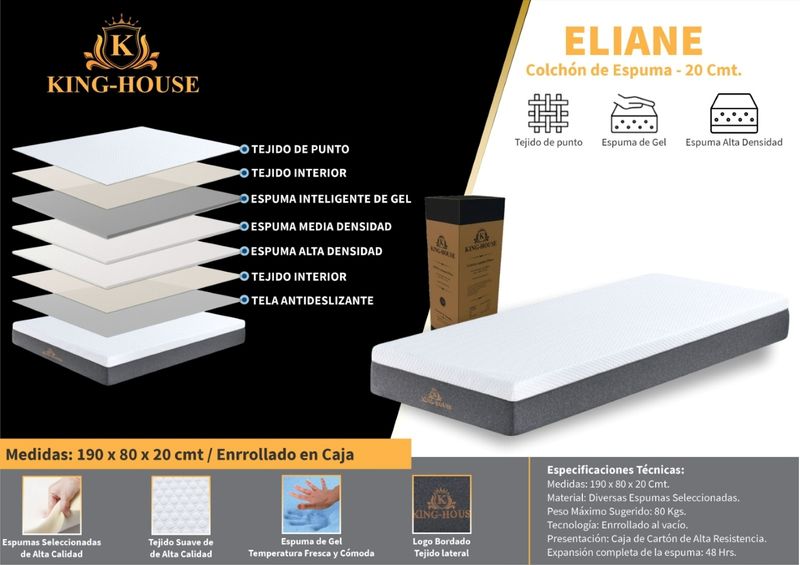 El colchón de Espuma King-House Modelo Eliane de 1 plaza, es la solución ideal para quienes buscan comodidad, soporte y practicidad.
