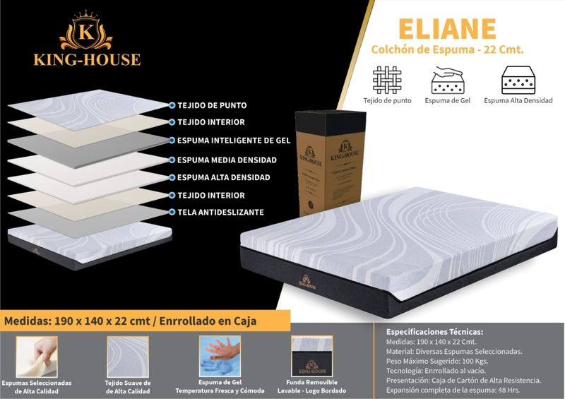 El colchón de Espuma King-House Modelo Eliane de 2 Plazas, es la solución ideal para quienes buscan comodidad, soporte y practicidad.