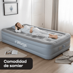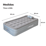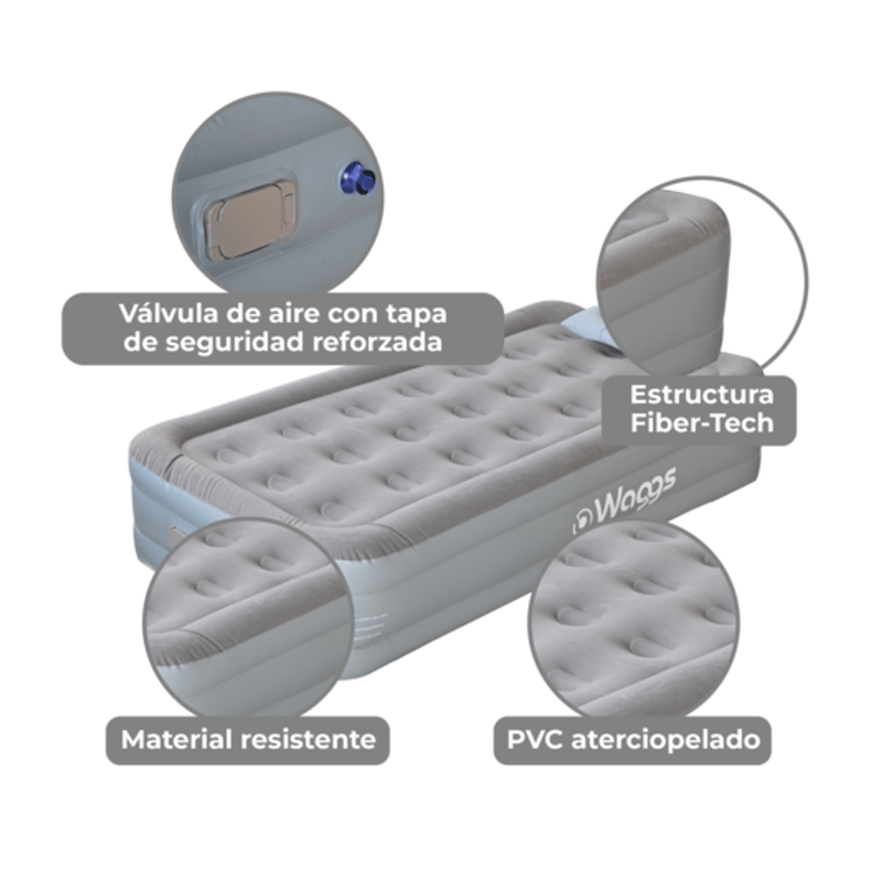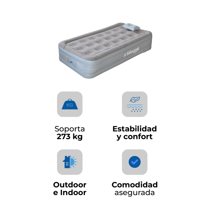 Con el colchón inflable de 1 plaza WAGGS COLI04 disfrutá un descanso portátil de nivel superior gracias a su inflado eléctrico USB, su estructura interna Fiber-Tech y su altura tipo sommier que brinda mayor confort y mejor postura. Diseñado para quienes buscan practicidad, armado rápido y comodidad real, se infla automáticamente en solo 2 a 4 minutos sin esfuerzo, ofreciendo una superficie firme, estable y uniforme que evita hundimientos y soporta hasta 273 kg. Su acabado de PVC felpado aporta suavidad y evita el deslizamiento de las sábanas, mientras que su formato liviano y portátil lo hace ideal para camping, viajes, mudanzas, visitas o uso indoor y outdoor. Incluye almohada inflable, bolso de transporte, bomba eléctrica USB y accesorios, convirtiéndose en una solución completa, moderna y confiable para descansar donde lo necesites, con la calidad y tecnología que distingue a WAGGS.