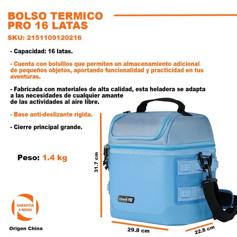 La Conservadora Bolso Térmico Coleman Pro es la solución ideal para aquellos que desean disfrutar de sus bebidas favoritas al aire libre. Con capacidad para 16 latas, su diseño compacto de 29,8 cm de largo, 22,8 cm de ancho y 31,7 cm de alto la convierte en un accesorio práctico para llevar a la playa, camping o picnics.