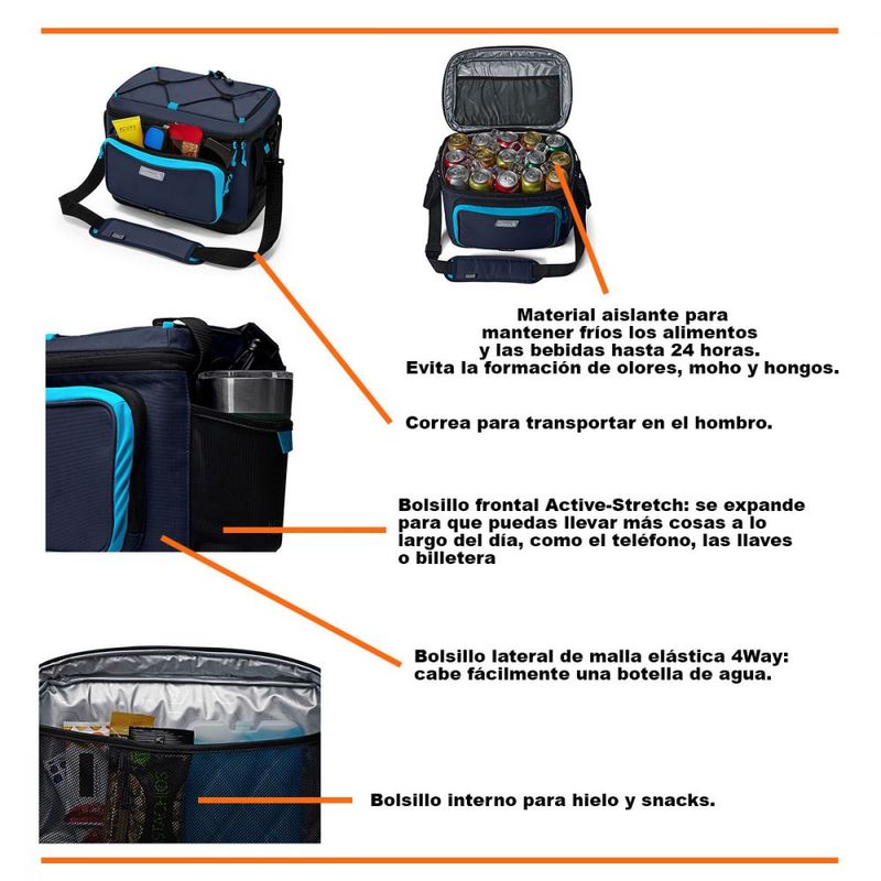 El bolsillo frontal se expande para que quepan todas tus cosas a lo largo del día, así que incluso después de guardar el teléfono, las llaves o pequeños snacks, seguirás teniendo más espacio para guardar otros objetos. Además, en el bolsillo lateral de malla elástica, cabe fácilmente una botella de agua. El agarre superior acolchado permite transportar la nevera cómodamente y acompañarte en todas tus actividades, incluso cuando está llena hasta los topes. La comida y la bebida se mantienen frías hasta 24 horas. Posee una capa a prueba de fugas que ayuda a evitar la formación de olores, moho y hongos.