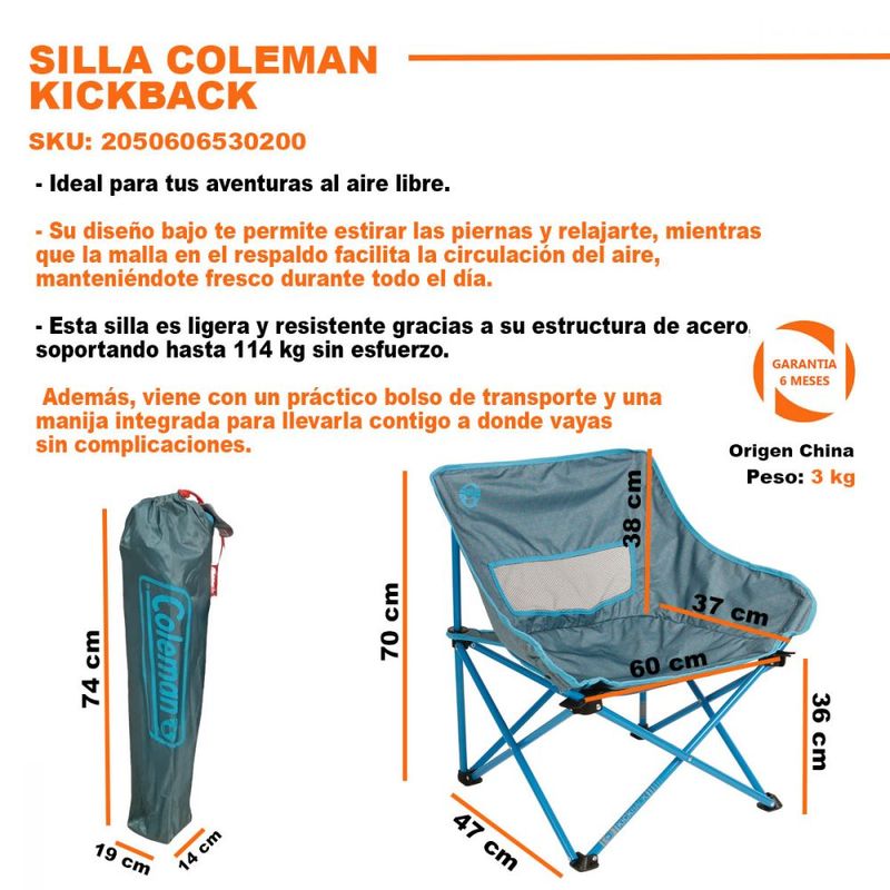Ideal para tus aventuras al aire libre. Su diseño bajo te permite estirar las piernas y relajarte, mientras que la malla en el respaldo facilita la circulación del aire, manteniéndote fresco durante todo el día. Esta silla es ligera y resistente gracias a su estructura de acero, soportando hasta 114 kg sin esfuerzo. Además, viene con un práctico bolso de transporte y una manija integrada para llevarla contigo a donde vayas sin complicaciones.
