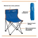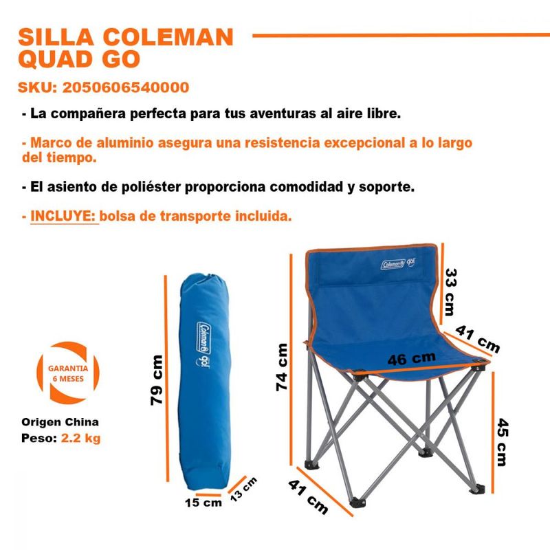 La Silla Coleman Quad Go es la compañera perfecta para tus aventuras al aire libre. Este modelo Quad Go destaca por su robustez y durabilidad. Su marco de aluminio asegura una resistencia excepcional a lo largo del tiempo, mientras que el asiento de poliéster proporciona comodidad y soporte. Con un peso ligero, es fácil de transportar gracias a su práctica bolsa de transporte incluida. Perfecta para camping, picnics o eventos deportivos, su color azul vibrante añade un toque de estilo a cualquier entorno.