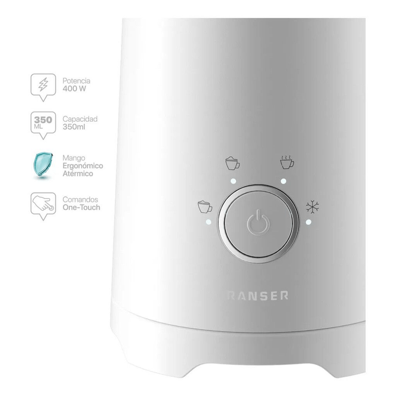 El Espumador Ranser Schiumarola MF-500 complementa el combo con una potencia de 400W y capacidad de 350 ml, ofreciendo 4 funciones automáticas controladas con un solo toque. Permite preparar espuma caliente espesa, espuma fina, leche caliente o espuma fría, adaptándose a distintas bebidas como cappuccinos, lattes o iced coffee. Su mango ergonómico atérmico y diseño en color crema aportan seguridad, elegancia y facilidad de uso.