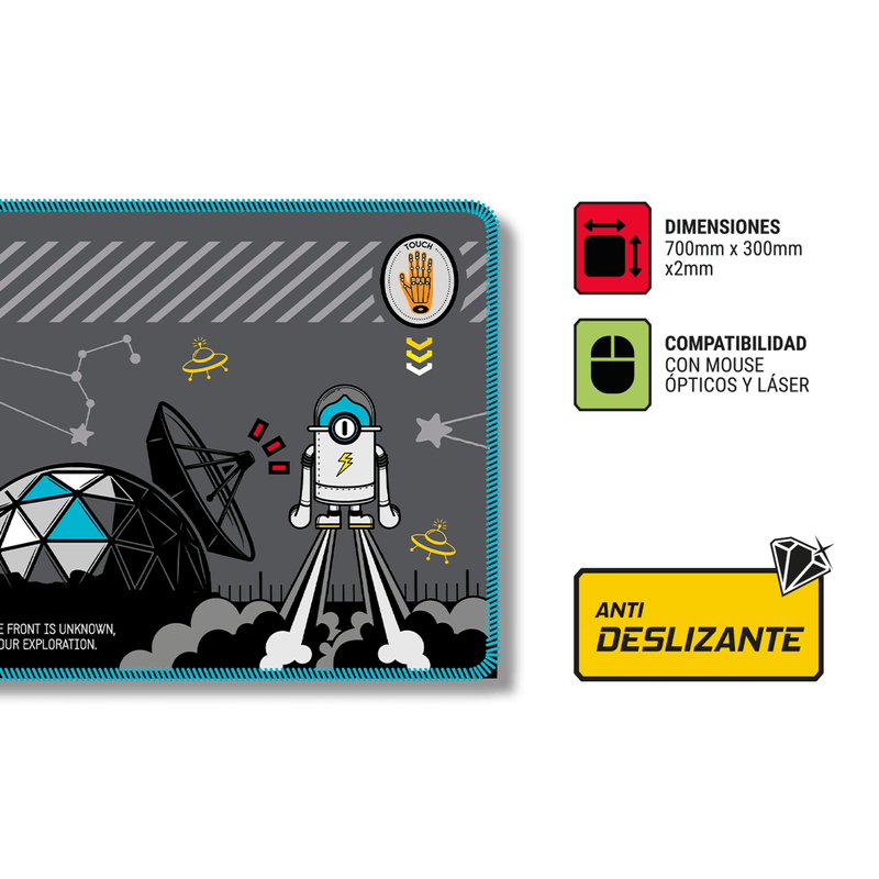 - Mousepad: - Base de goma antideslizante para mayor estabilidad. - Compatible con todos los tipos de mouse (ópticos y láser). - Dimensiones: 700 mm x 300 mm x 2 mm.