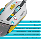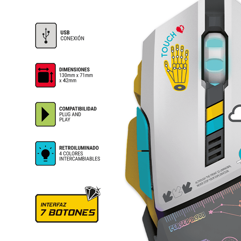 - Mouse gamer: - 7 botones programables y resolución DPI ajustable (1200-2400-4800-6600). - Retroiluminación en 4 colores intercambiables. - Cable trenzado de 1,5 m con anillo magnético. - Dimensiones: 130 mm x 71 mm x 42 mm.