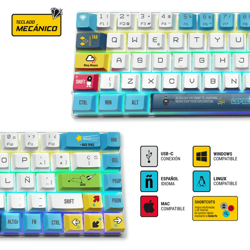 - Teclado mecánico: - 68 teclas retroiluminadas con diseño resistente a salpicaduras. - Comandos rápidos con tecla Fn. - Carcasa superior de metal y cable USB-C de 1,5 m. - Dimensiones: 312 mm x 104 mm x 35 mm.