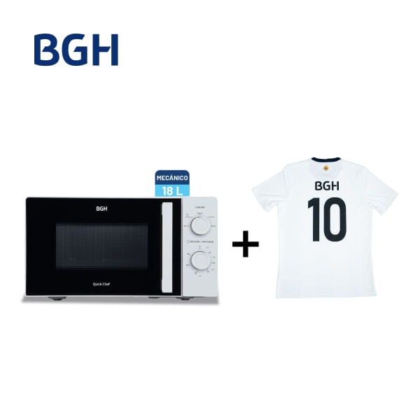 Combo Microondas BGH Mecánico 18L Blanco B118MB25 + Camiseta BGH adidas Talle M