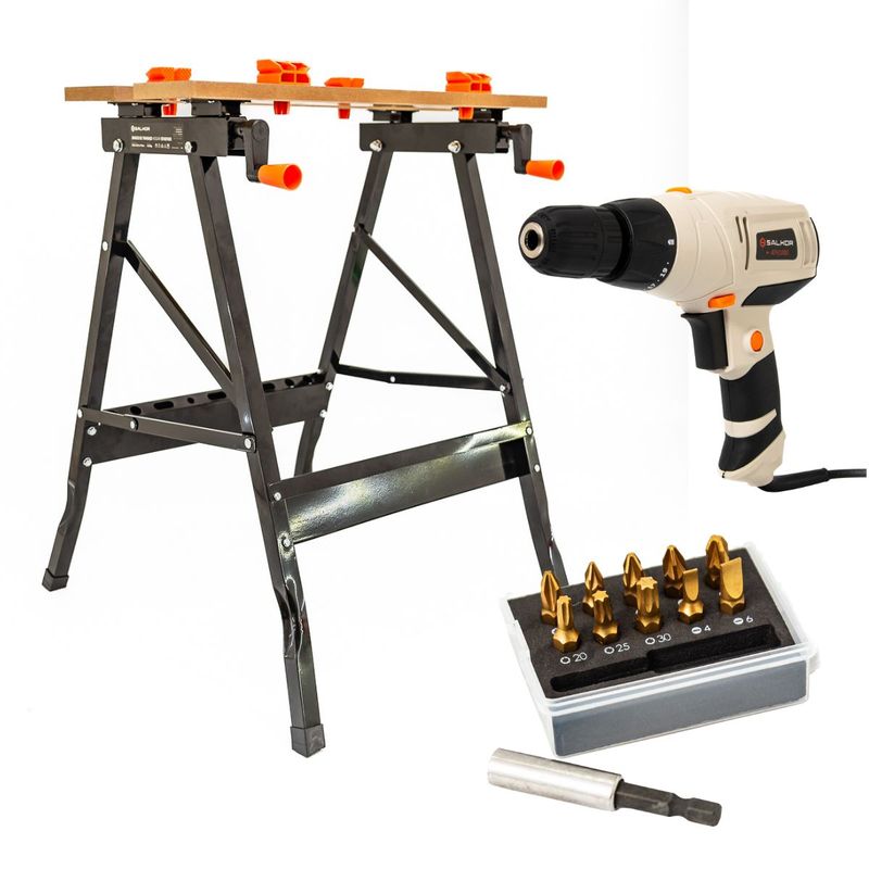 Combo Taladro Atornillador + banco De Trabajo + Set Puntas