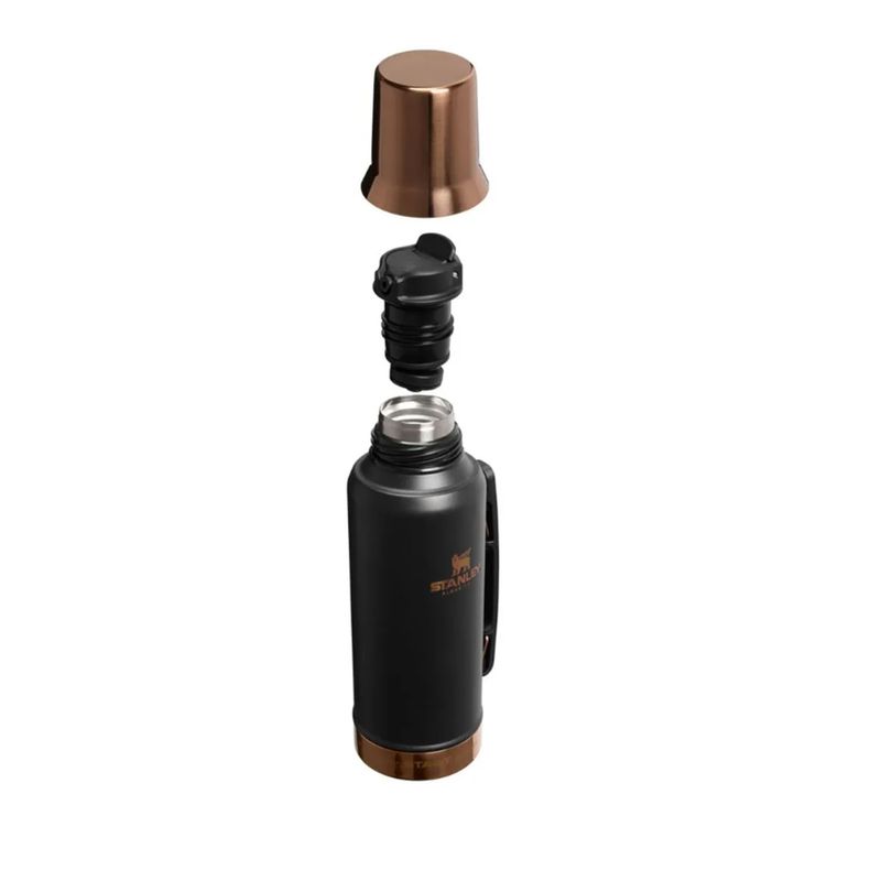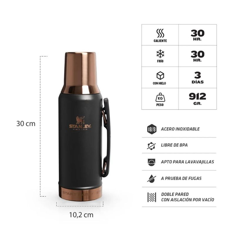 Start early. Stay late. Ese es el secreto. Esta colección Messi x Stanley 1913 en color negro Black Pebble viene con detalles en color oro rosado pulido que celebran un legado construido a base de años de trabajo duro y dedicación, y, de vez en cuando, un poco de magia. El Termo Mate System de 1,2 l cuenta con un pico de alta precisión único que no hace falta girarlo. Con levantar la pestaña conseguirás verter un chorro continuo. La tapa diseñada con aislamiento para que sea usada como mate, para que puedas alimentar tu propia magia dentro y fuera de la cancha.
