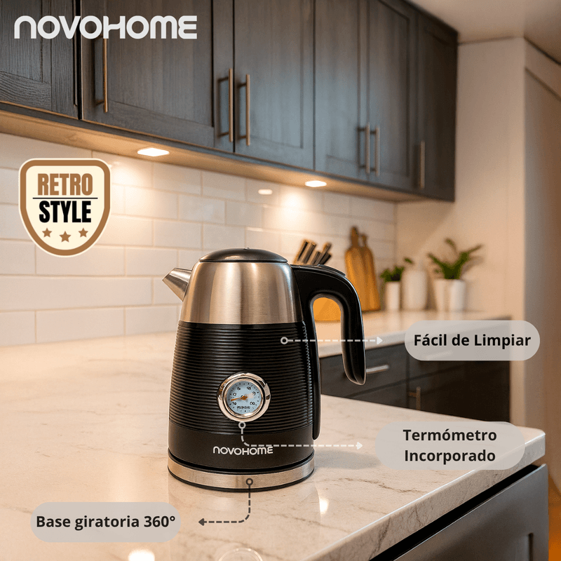 Redescubre el arte de hervir agua, la pava eléctrica Novohome Retro Style combina encanto vintage con tecnología moderna. Su diseño clásico, inspirado en las cocinas de antaño, se complementa con un termómetro análogo para un control preciso de la temperatura. Elegancia, funcionalidad y nostalgia en cada taza.