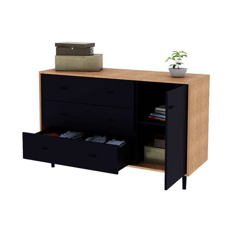 Esta cómoda le da a tu cuarto un toque de modernidad. Combina cajones con un sector de guardado con estantes en su interior. Actual y funcional, resulta fácil conseguirle un lindo espacio en tus ambientes. Combinala con la línea EVO.