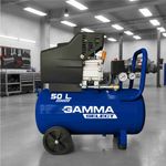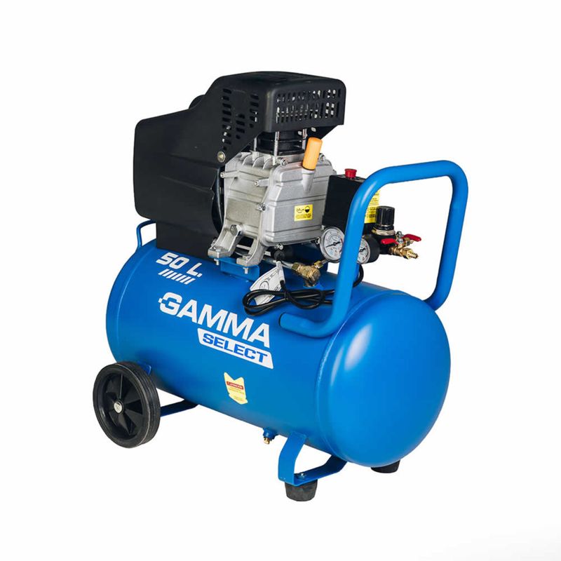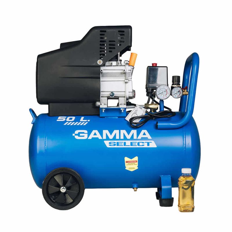 El compresor de aire Gamma Select de 50 litros es una versión de mayor autonomía y potencia, ideal para trabajos que requieren un flujo de aire constante en talleres o aplicaciones de bricolaje avanzado. Este modelo monofásico cuenta con un robusto motor de 2.5 HP, capaz de alcanzar una presión máxima de 116 psi (8 bar) y un caudal de aire de aproximadamente 203 L/min, lo que facilita tareas exigentes como el uso de herramientas neumáticas, pintura a soplete o limpieza profunda. Al igual que el modelo menor, prioriza la seguridad con su protector térmico y válvulas de sobrecarga, manteniendo un diseño transportable gracias a sus ruedas y mango ergonómico, consolidándose como un equipo de alto rendimiento, bajo mantenimiento y gran capacidad de almacenamiento.