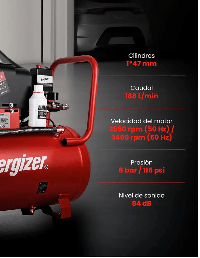 El compresor de aire lubricado EZC50D de ENERGIZER es la herramienta perfecta para quienes buscan potencia, eficiencia y durabilidad en un solo equipo. Diseñado para brindar un rendimiento óptimo en proyectos de inflado, limpieza y el uso de herramientas neumáticas, este compresor cuenta con un motor robusto de 2 HP que asegura un flujo constante de aire para satisfacer las demandas más exigentes. -No incluye el kit de accesorios para compresor.- Su tanque horizontal de 50 litros ofrece una capacidad ideal para prolongar el tiempo de trabajo sin interrupciones, mientras que su presión máxima de 115 psi permite ejecutar tareas tanto profesionales como domésticas con precisión y eficacia. El cilindro de 47 mm garantiza una operación potente y estable, brindando la fuerza necesaria para aplicaciones variadas. Además, el EZC50D está diseñado pensando en la comodidad del usuario, presentando un nivel sonoro reducido de 84 dB que minimiza el ruido durante su funcionamiento. Su velocidad ajustable, que varía entre 2850 y 3450 rpm, permite adaptar el rendimiento según las necesidades específicas del trabajo, optimizando así la eficiencia y la vida útil del equipo. Con un diseño compacto y resistente, este compresor es fácil de transportar y almacenar, convirtiéndose en una herramienta versátil y confiable para talleres, garajes y uso doméstico.