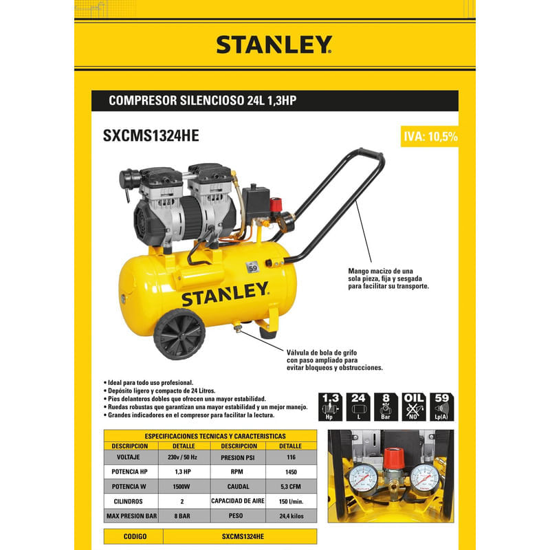 Compresor De Aire Stanley Silencioso 24 Lts 1.3 Hp