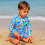 Conjunto de remera y short infantil con protección solar UV50 certificada, ideal para playa, pileta. Tela de secado rápido y liviana. Estampas exclusivas y colores vibrantes para niños de 4 a 10 años.