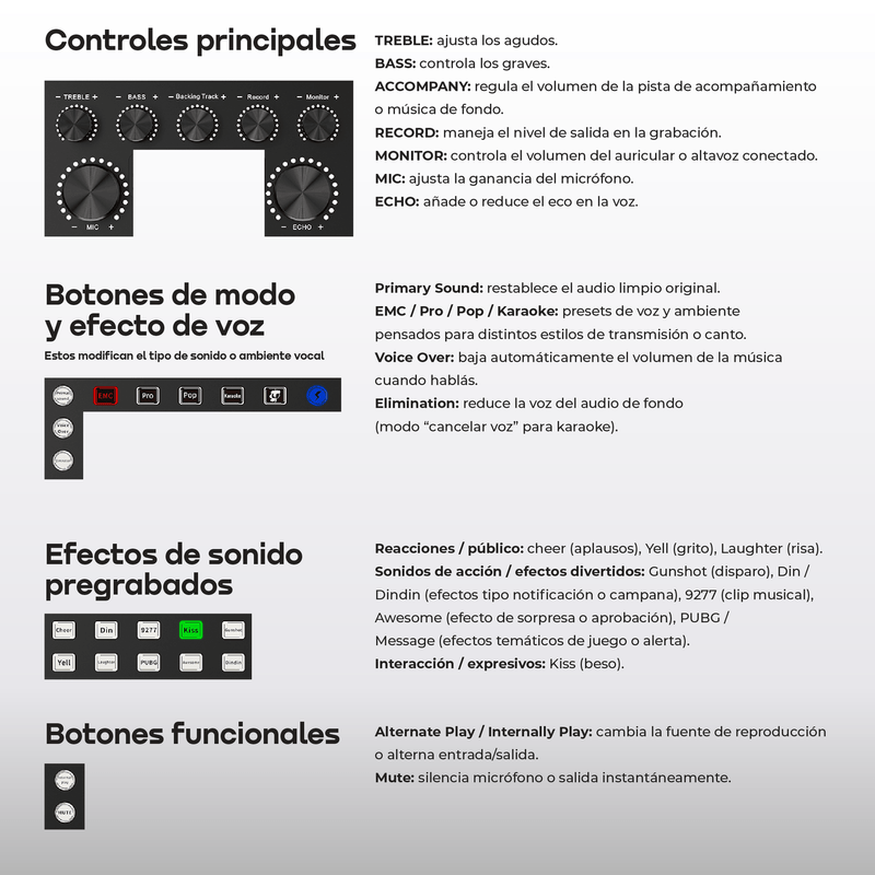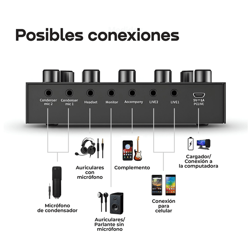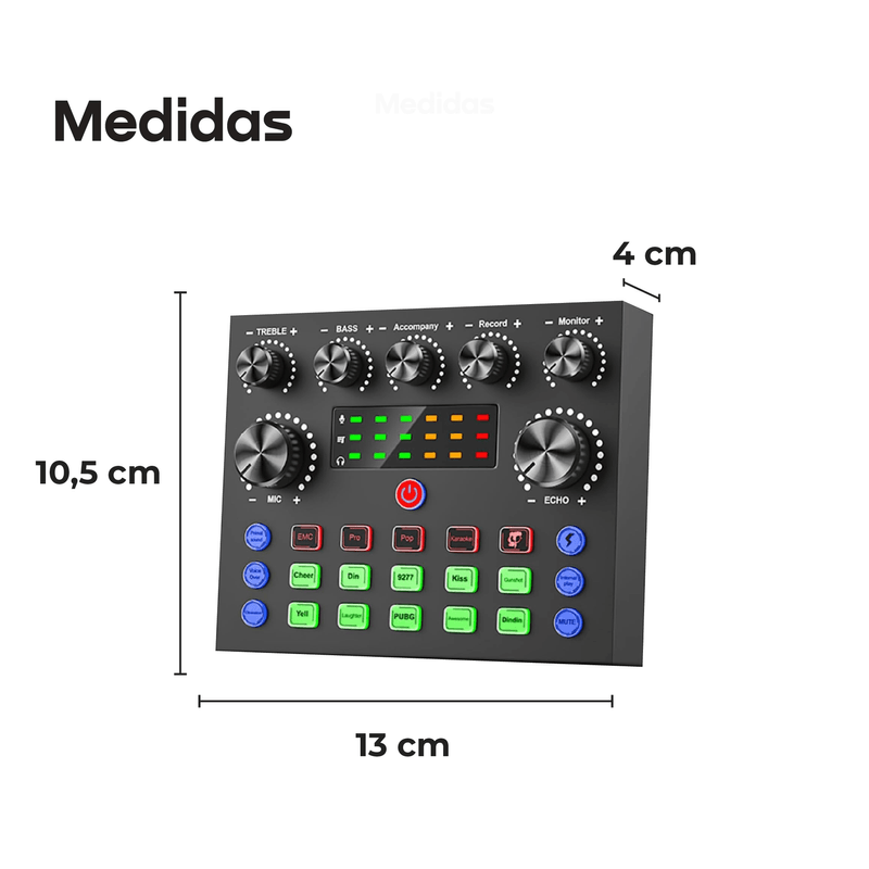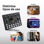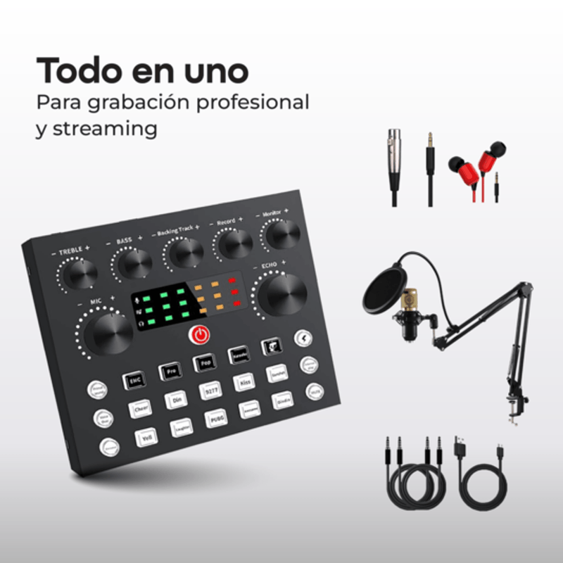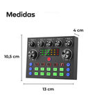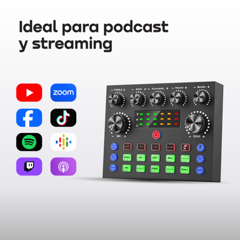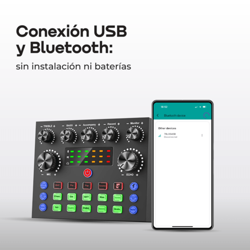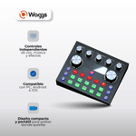 La tarjeta de sonido WAGGS MICR05 V8 es el dispositivo ideal para grabar, mezclar y transmitir con calidad profesional desde cualquier lugar. Compacta, portátil y de uso inmediato, convierte tu espacio en un mini estudio sin necesidad de software ni configuraciones complejas. Incorpora efectos integrados, conectividad Bluetooth para acompañamiento musical, alimentación por USB y controles independientes para voz, música y efectos. Compatible con PC, Android e iOS, ofrece sonido claro gracias a su chip DSP con reducción de ruido. Incluye entradas para micrófono y acompañamiento, salidas para auriculares y smartphone, e iluminación LED indicadora. Ligera y práctica, la WAGGS MICR05 es tu estación de sonido lista para usar, ideal para crear, grabar o transmitir con estilo y calidad profesional.