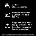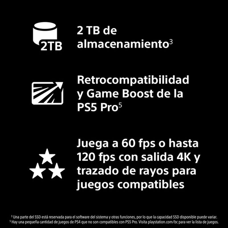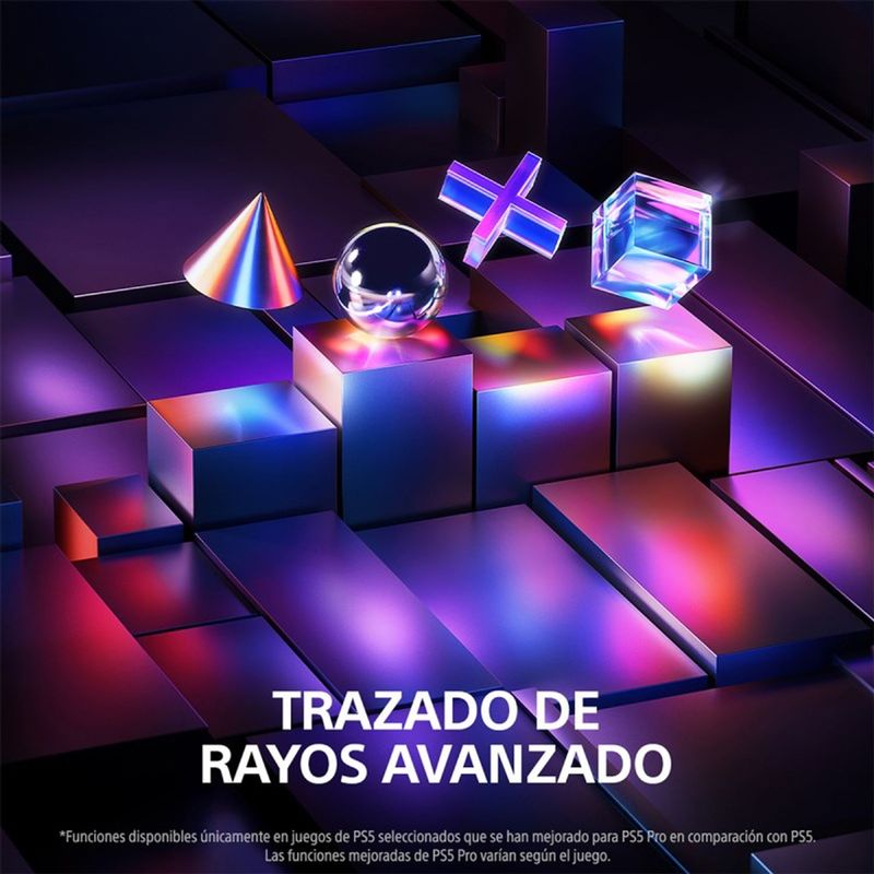 Consola PS5 PlayStation 5 Pro Sé testigo del verdadero poder de los juegos Con PlayStation_5 Pro, los creadores de juegos más importantes pueden mejorar sus juegos con increíbles funciones como trazado de rayos avanzado, claridad de imagen supernítida para TV 4K y partidas con alta velocidad de fotogramas. Esto significa que puedes jugar títulos de PS5_ con las imágenes más impresionantes posibles en una consola PlayStation_. Superresolución espectral PlayStation_ (PSSR) Obtén unaclaridad de imagen supernítida en tu TV 4K gracias a la resolución mejorada con IA para jugar en ultraalta definición con un nivel de detalle asombroso Trazado de rayos Avanzado Experimenta un realismo de nivel superior con reflejos de trazado de rayos, sombras e iluminaciónglobal d.e alta calidad mientras exploras los asombrosos mundos de los juegos 2 TB de almacenamiento Mantén tus títulos favoritos listos para jugar con un 2 TB de almacenamiento SSD incorporado -Origen: China -Garantia: 12 meses
