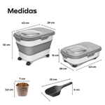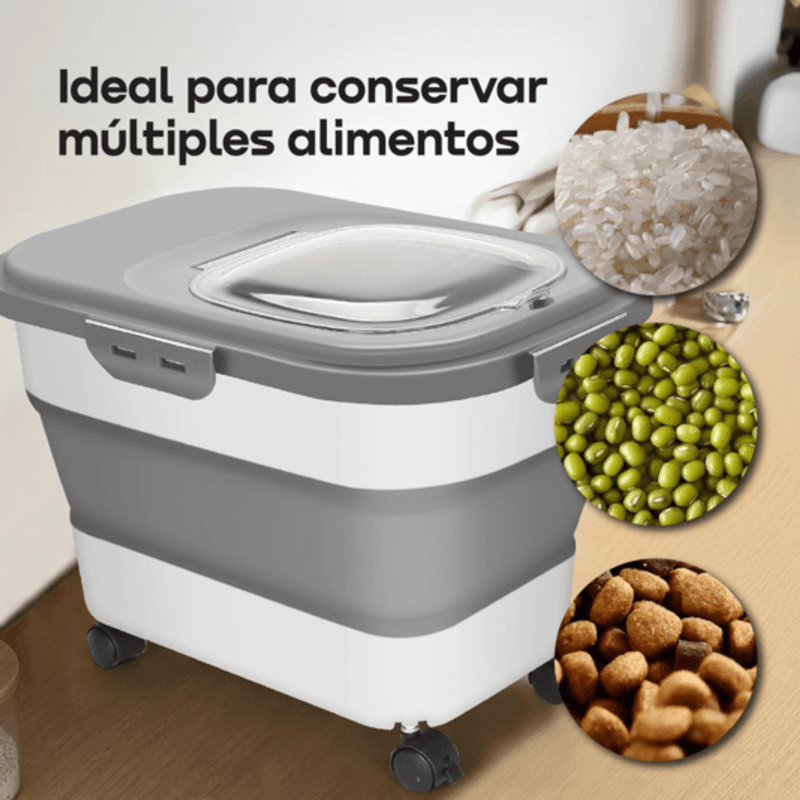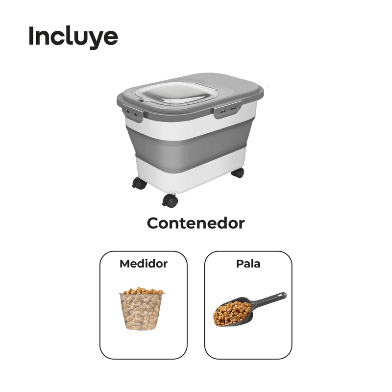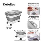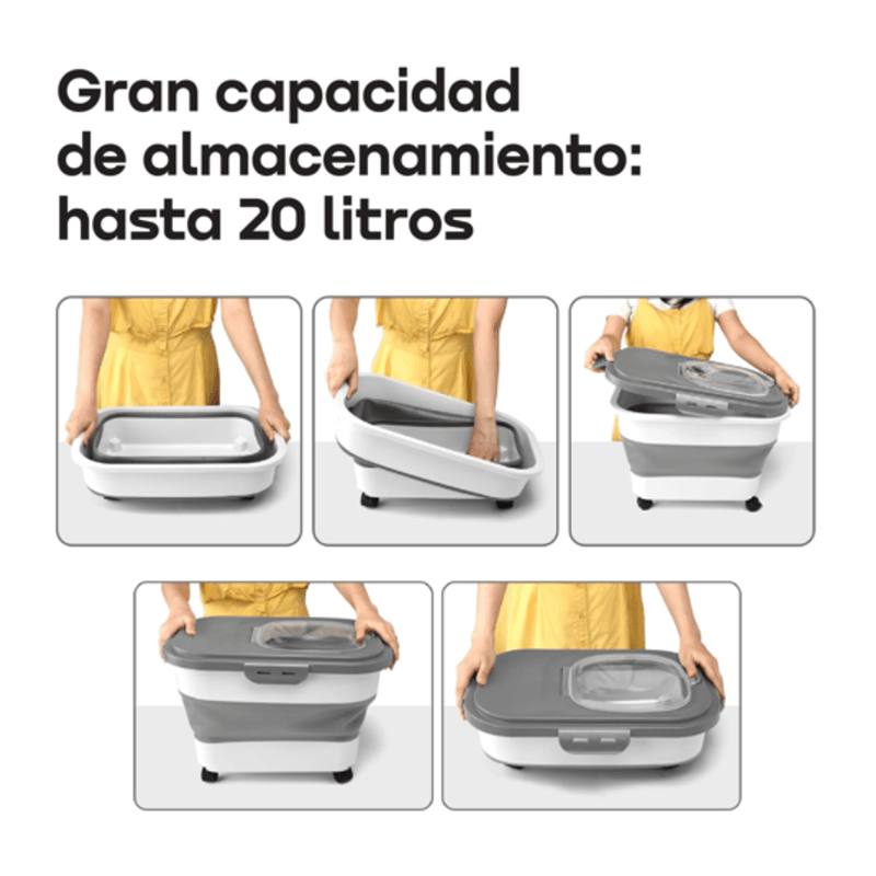 El contenedor plegable para alimento de mascotas WAGGS PETF18 ofrece almacenamiento inteligente con diseño moderno y máxima practicidad. Su estructura expandible de hasta 20 litros permite guardar una gran cantidad de croquetas o snacks y plegarse fácilmente cuando está vacío, optimizando el espacio. La tapa imantada con cierre hermético y junta de silicona mantiene el alimento seco, fresco y libre de humedad, mientras que las ruedas integradas —dos con freno— facilitan el traslado y aseguran estabilidad. Fabricado en materiales de grado alimenticio libres de BPA, incluye pala dosificadora, vaso medidor con marcas y compartimiento para disecantes. Ideal para hogares con mascotas medianas o grandes, el WAGGS PETF18 combina durabilidad, orden y comodidad en un solo diseño funcional.