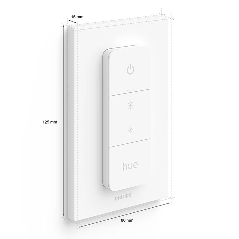 Alimentación: Batería incluída 1 x CR2450. Vida útil: 50.000 clicks. Es inalámbrico, no requiere de instalación. Banda de frecuencia 2400 - 2483.5 MHz. Cantidad máx. de luces por interruptor: 10, si no están conectadas al bridge Hue. Duración mínima de la batería: 3 año(s). Actualizable por software cuando se conecta al Hue Bridge. Peso incluyendo la placa de pared: 67 g. Peso del interruptor: 37 g. Conexión Zigbee Light/Protocol IEEE 802.15.4. Rango mínimo interior: 500 in/12 mts. Compatible con todos los bridge HUE. La unidad de control del dimmer switch es magnética y se puede quitar de la placa de base. La base cuenta con una cinta adhesiva para colocar. El Dimmer Switch, necesita al menos una lámpara y un Bridge para funcionar en forma inteligente. Con el dimmer switch Philips Hue, se puede ajustar suavemente su configuración de luz favorita, hacia arriba y hacia abajo. Cuenta con 4 teclas On/OFF y + / -.