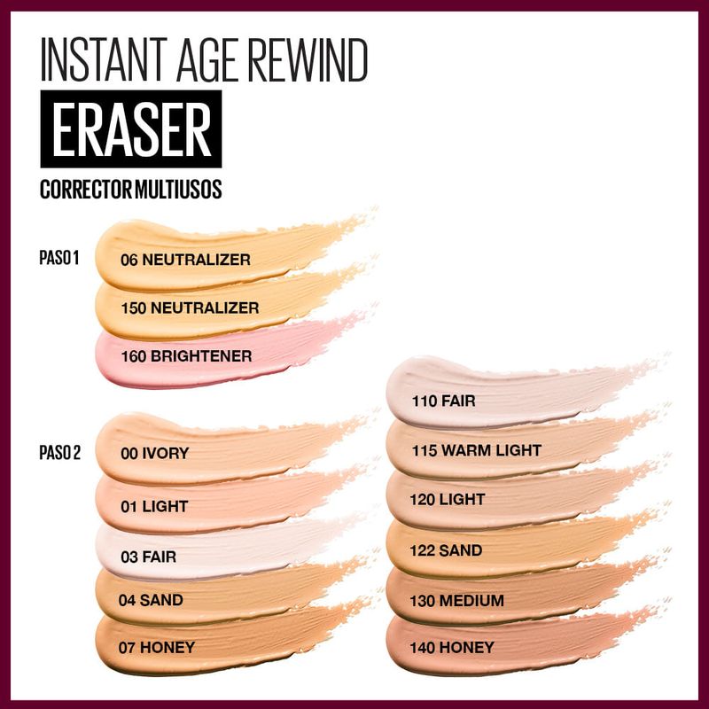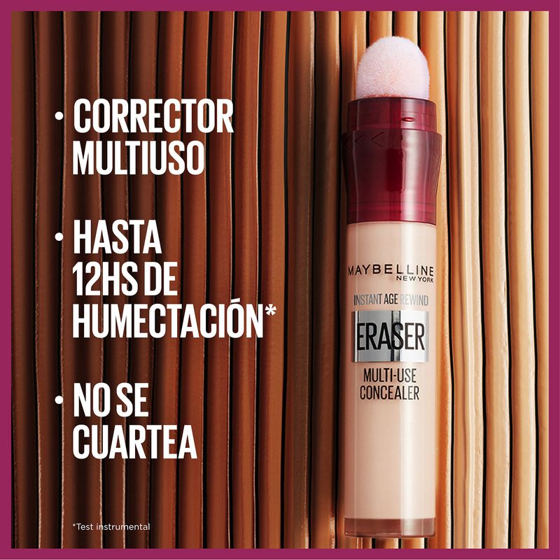 El corrector Instant Age Rewind es el corrector anti-edad de Maybelline. Su fórmula activa y aplicador microcorrector borra al instante las ojeras, bolsas y líneas finas, para lograr una mirada más radiante.