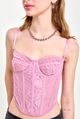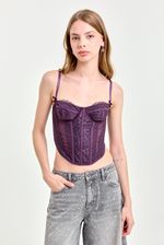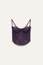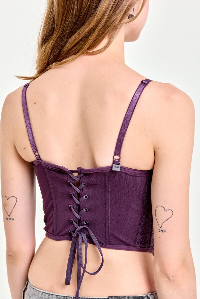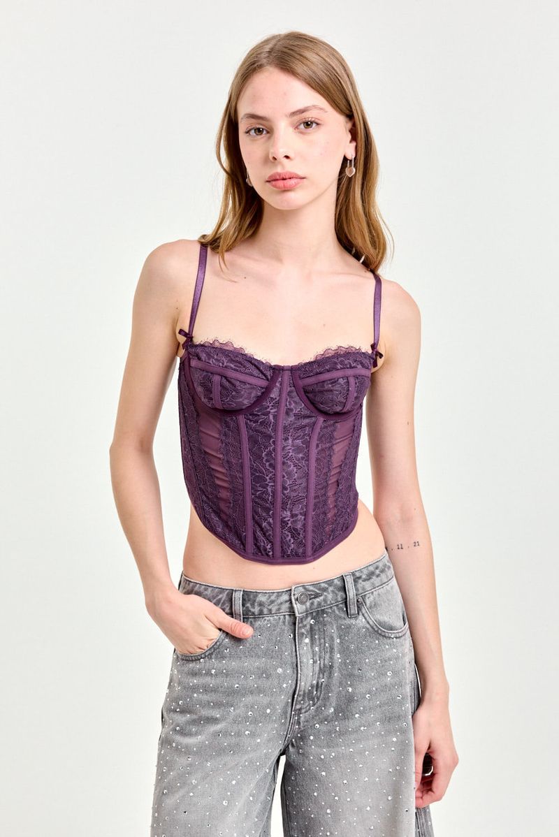 Corset confeccionado en microtul y encaje elastizado, con aros y ballenas internas que aportan estructura y realce. Cuenta con breteles regulables y espalda con sistema lace-up mediante lazo ajustable. Sus detalles delicados y el calce firme lo convierten en una prenda ideal para looks de noche o eventos.
