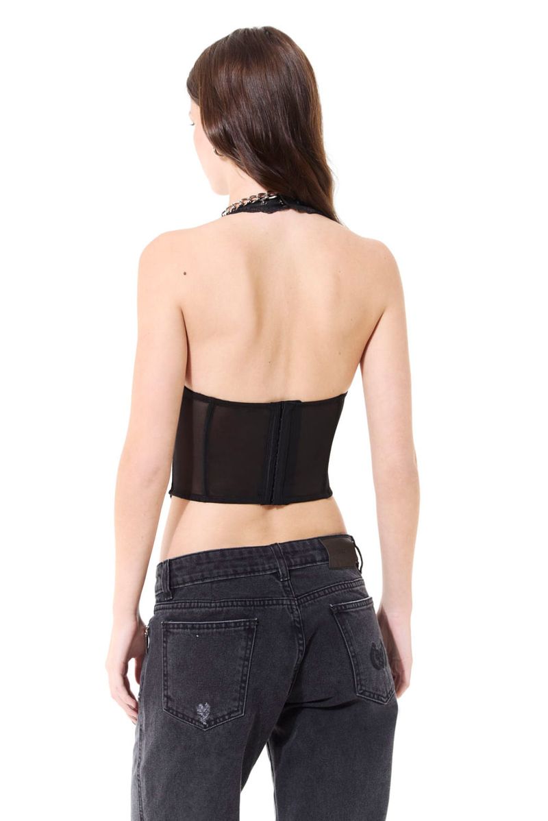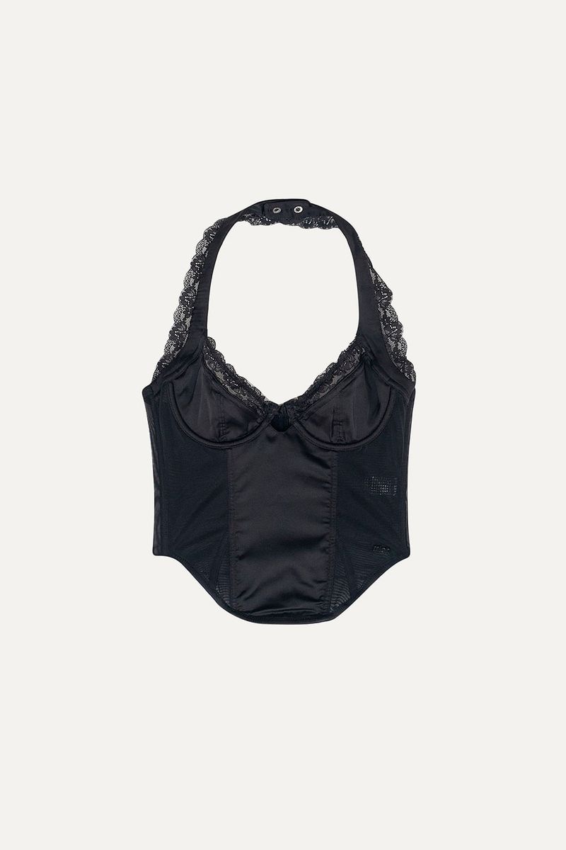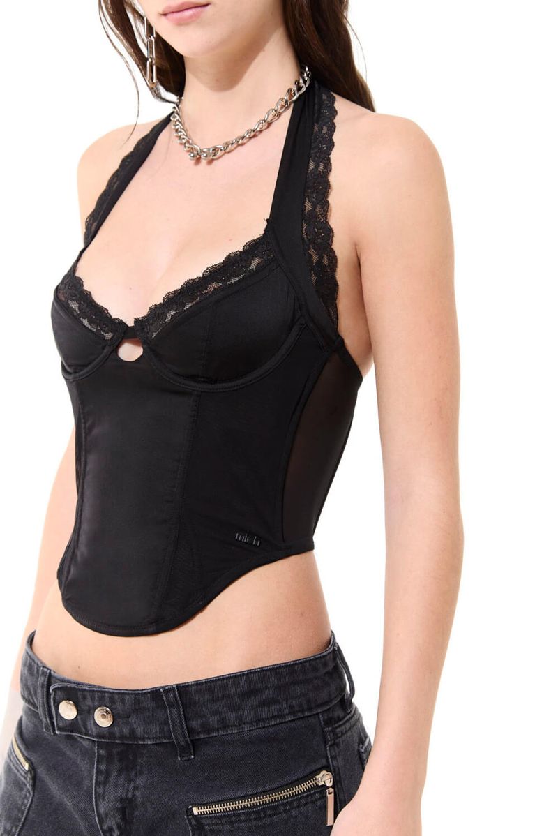 Corset en microtul elastizado combinado con satén. Incluye aros en busto, ballenas en cuerpo y breteles al cuello regulables. Cierre trasero con ganchos en tres posiciones. Ideal para looks de noche con pantalones cargo o faldas ajustadas.