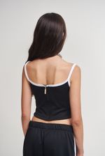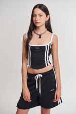 Top tipo corset de deportivo frizado. Detalle de tiras aplicadas en el delantero. Ruedo terminado con forma curvada. Cierre al tono en centro espalda con tiracierre personalizado. Breteles y escote a contratono. Estampa logo en el frente.